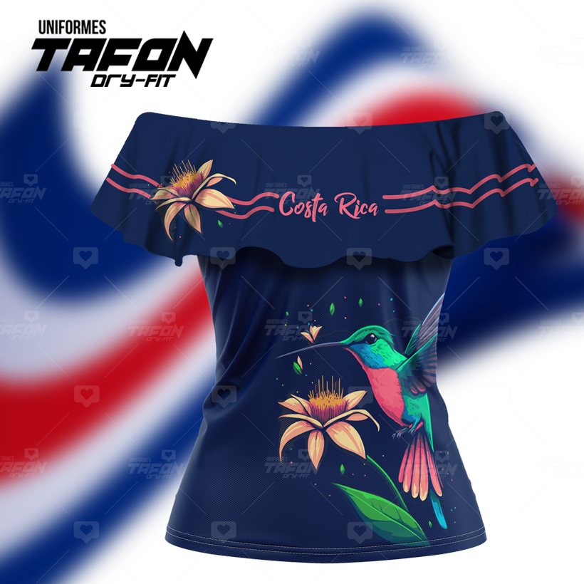 Blusa femenina sublimada en azul oscuro elegante, con un diseño que mezcla tradición y naturaleza. El vuelo superior lleva la inscripción Costa Rica acompañada de flores en tonos cálidos, evocando el orgullo nacional.