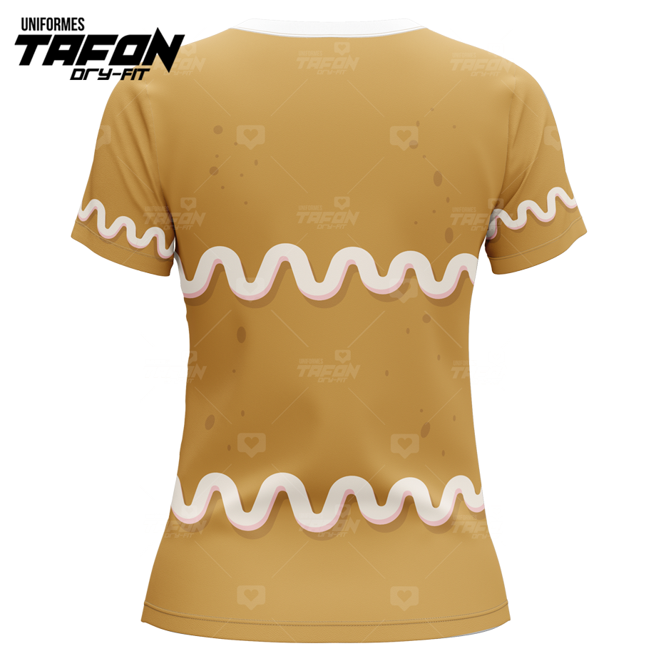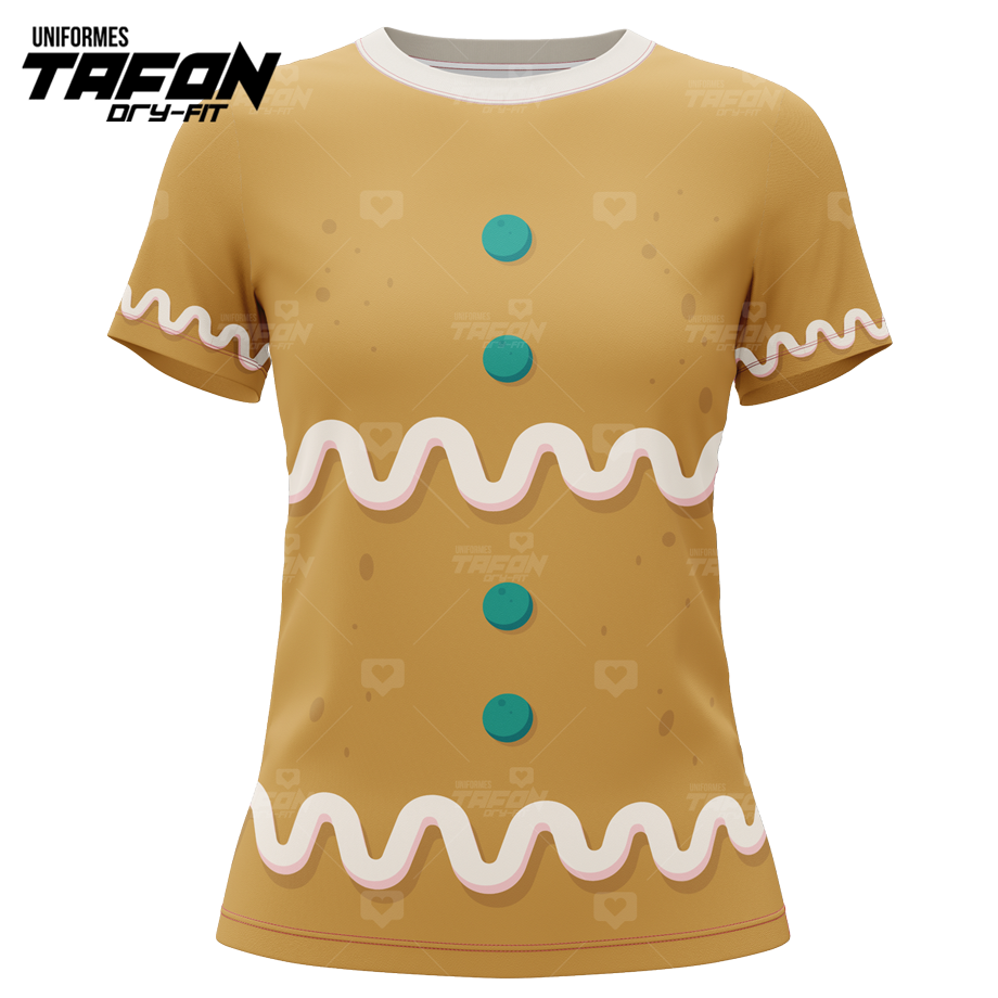 Este diseño representa una camiseta sublimada inspirada en la galleta de jengibre navideña 🍪✨La prenda está elaborada en un tono marrón dorado, que evoca el color clásico de la masa horneada. En el frente destacan tres botones turquesa y detalles impresos de glaseado blanco en forma ondulada, tanto en el pecho como en las mangas, imitando el decorado típico de las galletas de Navidad.