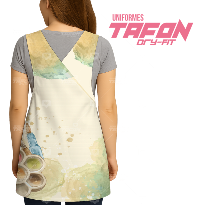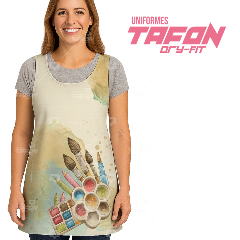 Este delantal japonés está inspirado en la creatividad y el arte, ideal para maestras y artistas que disfrutan transmitir su pasión. El diseño presenta un estilo acuarela con pinceles, lápices de colores y paleta de pintura, todo ilustrado en tonos suaves que evocan inspiración y frescura.