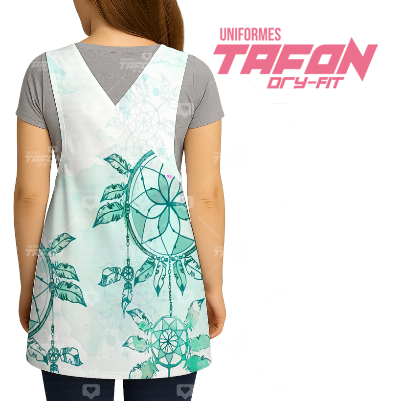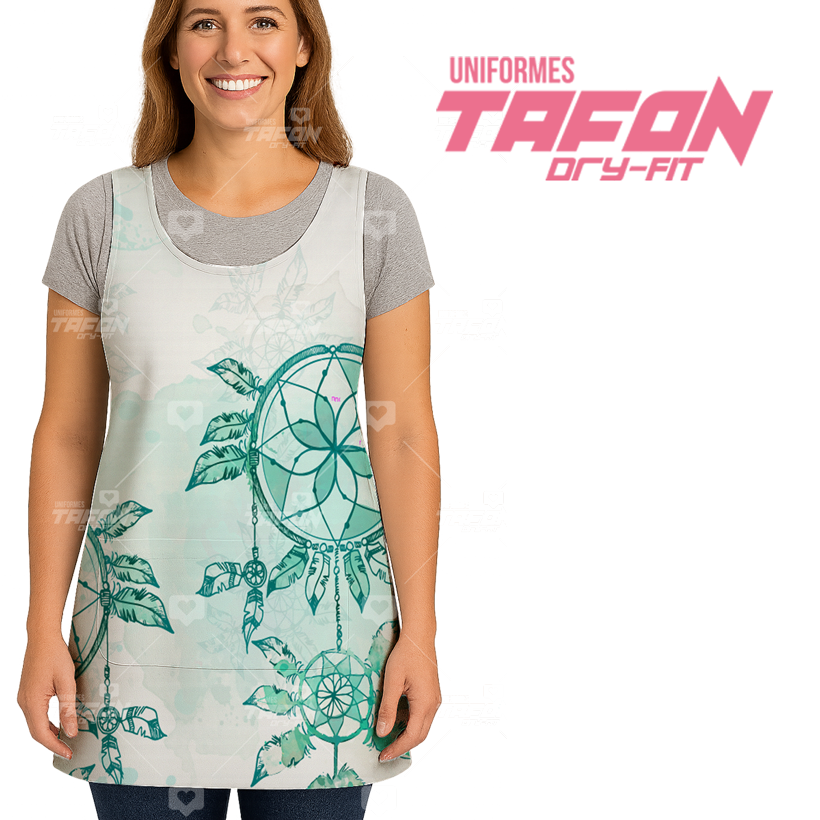 Este delantal japonés destaca por su diseño místico y relajante, inspirado en los atrapasueños. Sobre un fondo blanco con suaves tonos verdes acuarela, se aprecian grandes mandalas y atrapasueños con plumas estilizadas, que evocan calma, creatividad y buena energía.