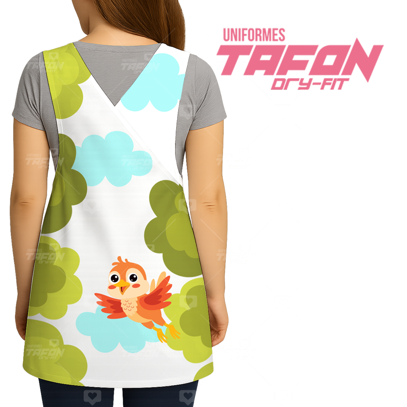 Este delantal tipo japonés combina comodidad y alegría con un diseño lleno de color y ternura. Elaborado en tela dry-fit ligera y fresca, ideal para largas jornadas en el aula.