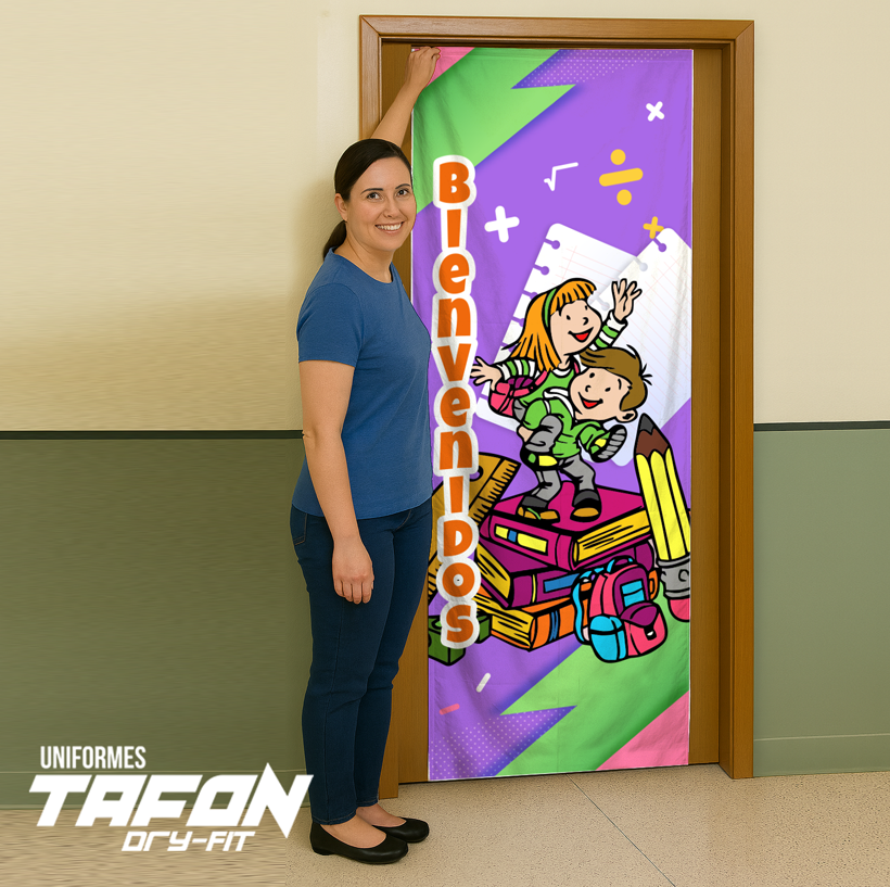 Vestido para puerta con el texto “Bienvenidos” en vertical sobre un fondo morado con detalles geométricos coloridos. La ilustración muestra a dos niños felices sobre una pila de libros gigantes, rodeados de útiles escolares como lápiz y mochila. Un diseño dinámico y llamativo, ideal para dar la bienvenida en aulas escolares.