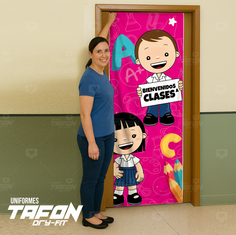 Vestido para puerta con fondo fucsia decorado con íconos escolares y letras. Presenta a dos niños sonrientes en uniforme, uno de ellos sosteniendo un cartel con el mensaje “Bienvenidos a Clases”. Un diseño alegre y colorido, ideal para dar la bienvenida en el regreso a clases.