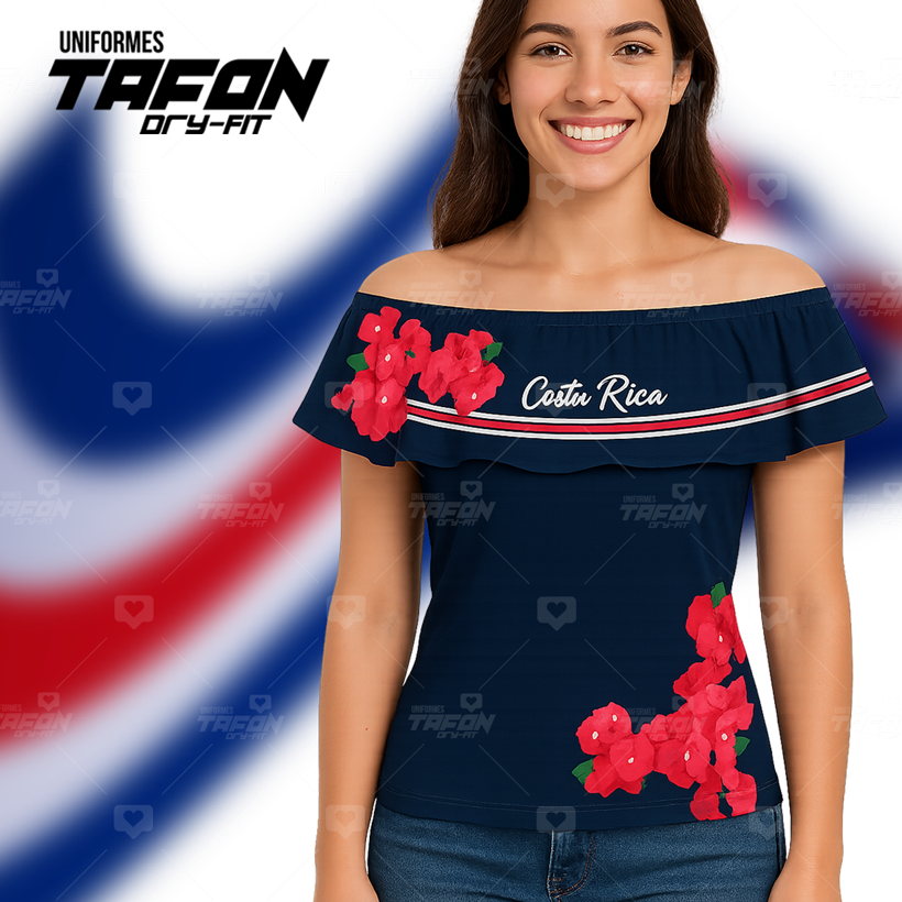 Blusa femenina sublimada en color azul oscuro elegante, diseñada con un vuelo superior estilo tradicional que incorpora la frase Costa Rica junto a las franjas de la bandera nacional.