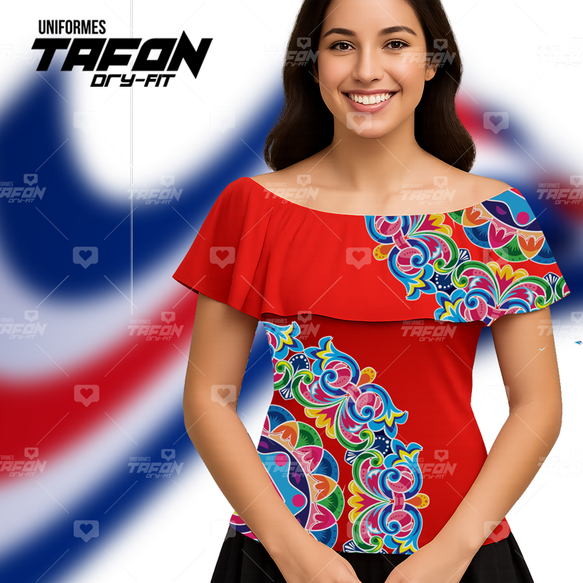 Blusa femenina sublimada en color rojo vibrante, con un elegante vuelo amplio en el escote, diseñado para resaltar la tradición y el orgullo nacional.