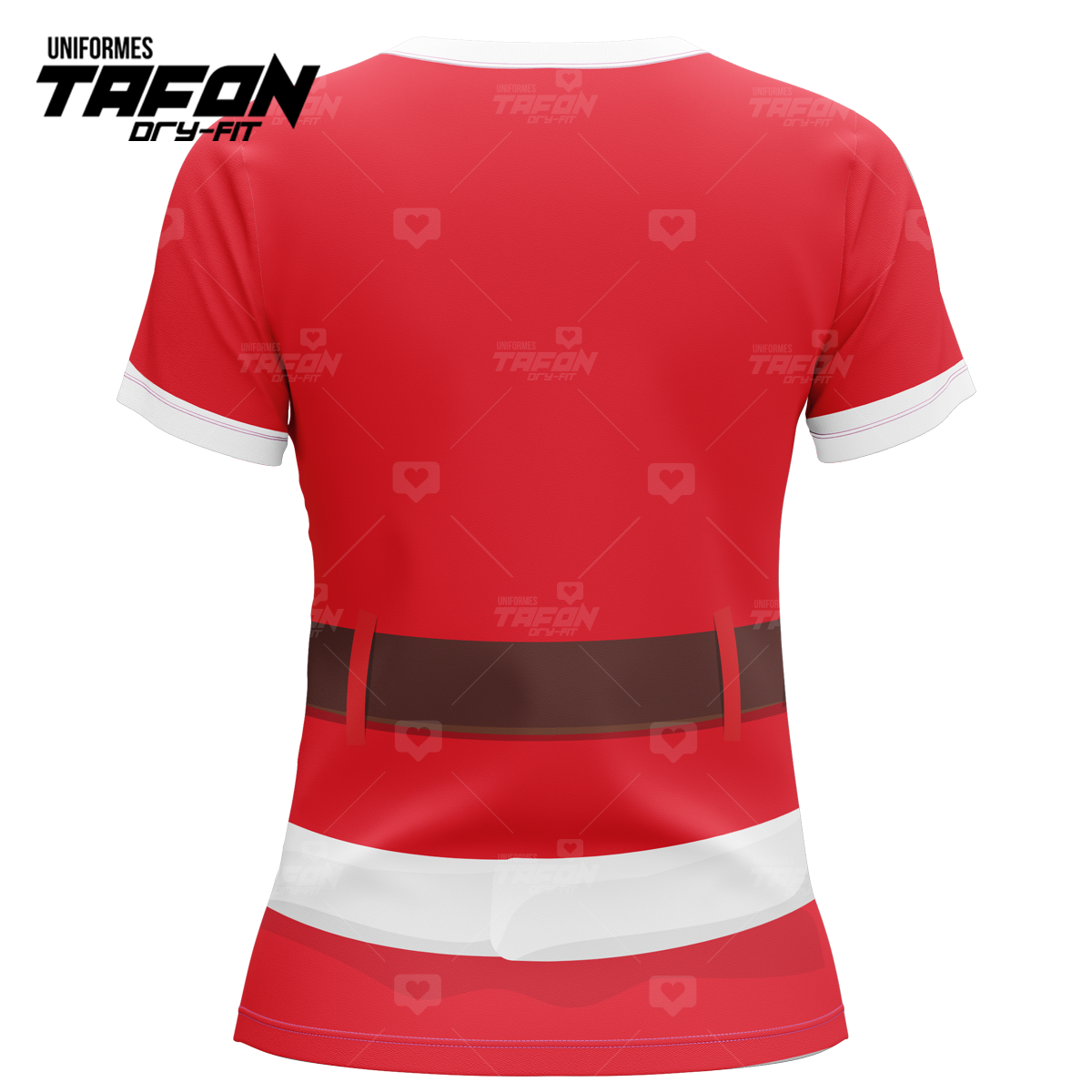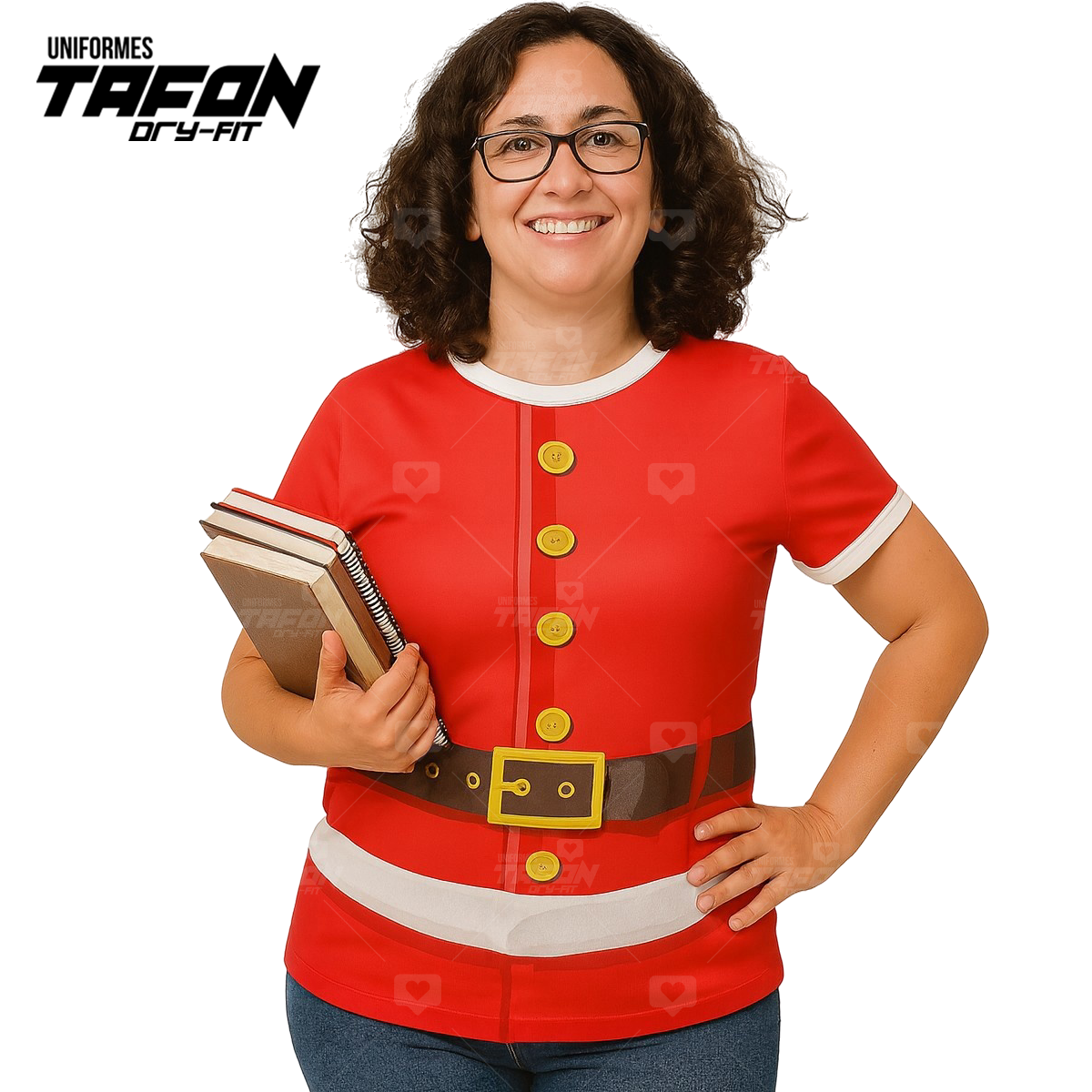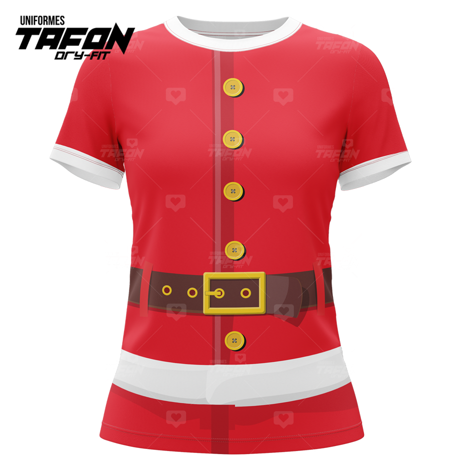 Este diseño representa una camiseta sublimada inspirada en el traje clásico de Santa Claus 🎅✨La prenda está elaborada en color rojo brillante, con detalles impresos que simulan el atuendo navideño más icónico: una franja vertical con botones dorados, un cinturón marrón con hebilla dorada, y ribetes blancos en cuello y mangas que evocan el característico borde del traje de Papá Noel.