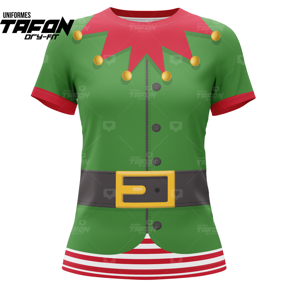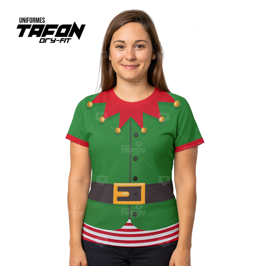 Camiseta sublimada inspirada en el clásico traje de duende navideño 🧝♂️. El diseño combina tonos verdes y rojos con detalles impresos como botones dorados, cinturón y cuello en forma de puntas festivas, simulando el atuendo tradicional de los ayudantes de Santa. Fresca, cómoda y llena de alegría, perfecta para celebrar la Navidad con estilo y diversión.