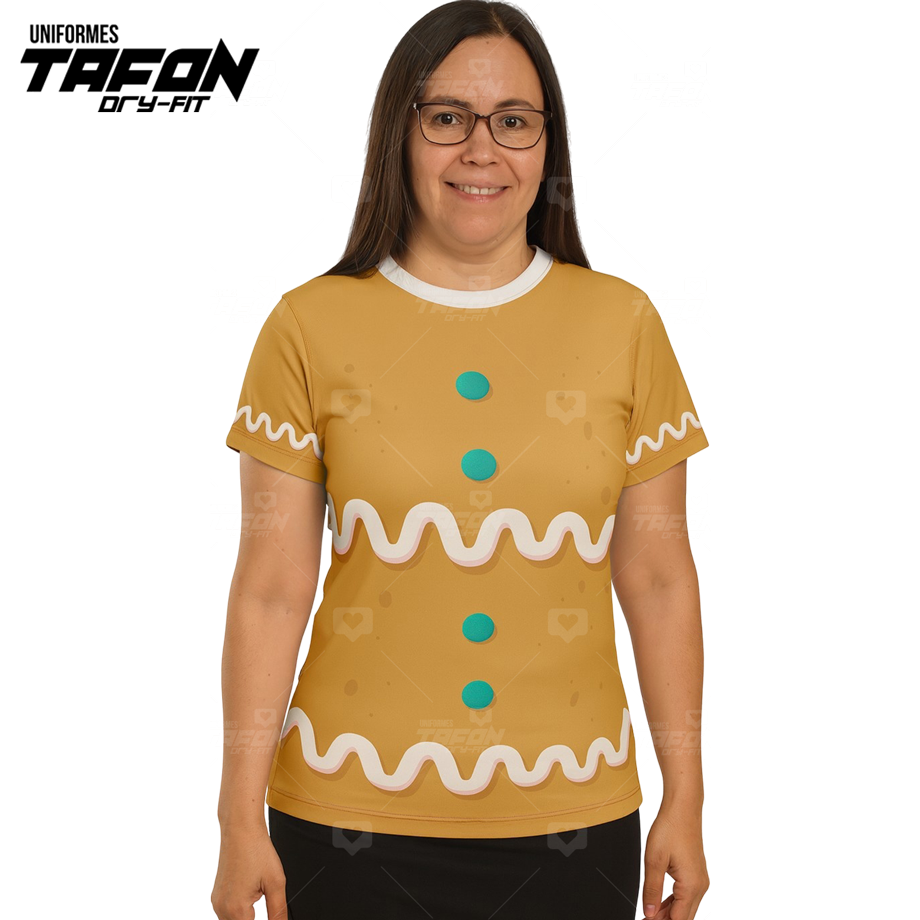 Este diseño representa una camiseta sublimada inspirada en la galleta de jengibre navideña 🍪✨La prenda está elaborada en un tono marrón dorado, que evoca el color clásico de la masa horneada. En el frente destacan tres botones turquesa y detalles impresos de glaseado blanco en forma ondulada, tanto en el pecho como en las mangas, imitando el decorado típico de las galletas de Navidad.