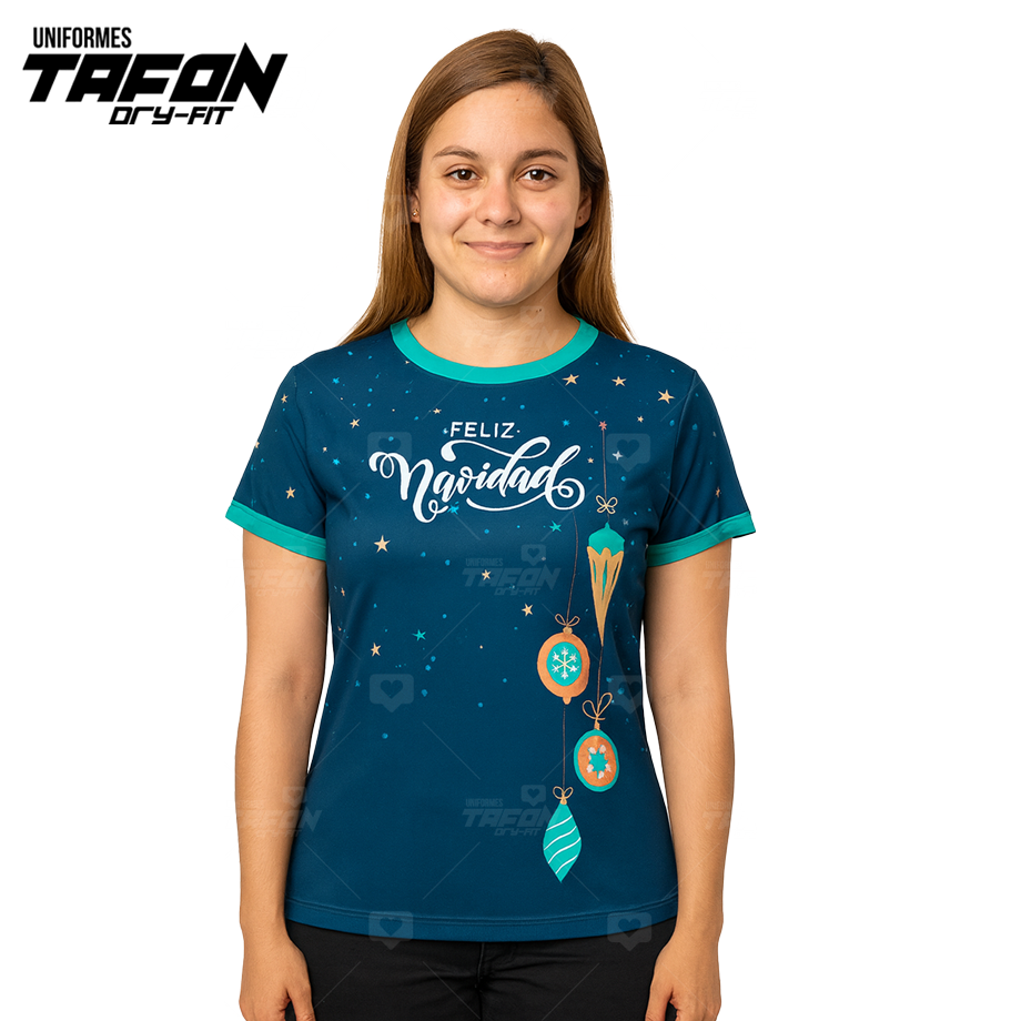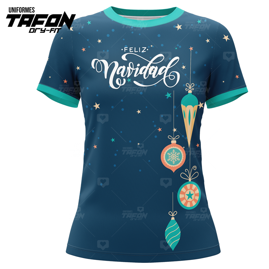 El diseño muestra una camiseta sublimada en tono azul navideño, con el mensaje "Feliz Navidad" en tipografía elegante, acompañado de un patrón de estrellas y adornos colgantes en colores turquesa y dorado. Los detalles en los bordes de las mangas y el cuello, en tono verde menta, le dan un toque moderno y fresco.