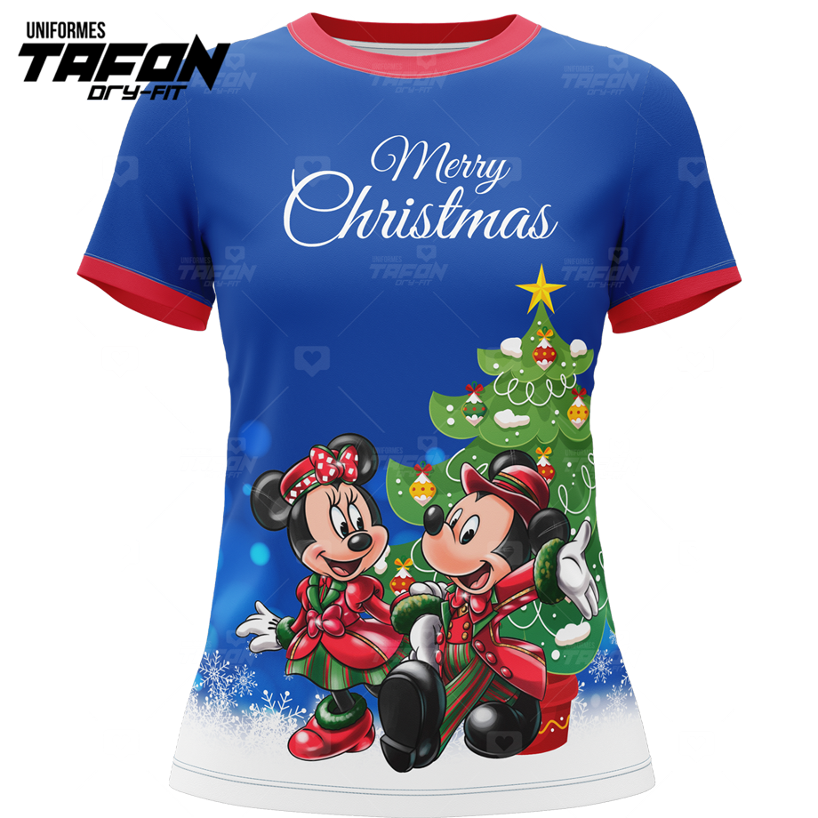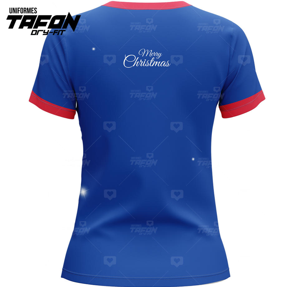 Este diseño presenta una camiseta sublimada navideña llena de color, alegría y espíritu festivo 🎄💙La prenda combina un vibrante tono azul royal con detalles en rojo navideño en el cuello y las mangas. En el centro, se destacan adorables personajes con atuendos de Navidad, posando junto a un árbol decorado con estrellas y esferas brillantes.
