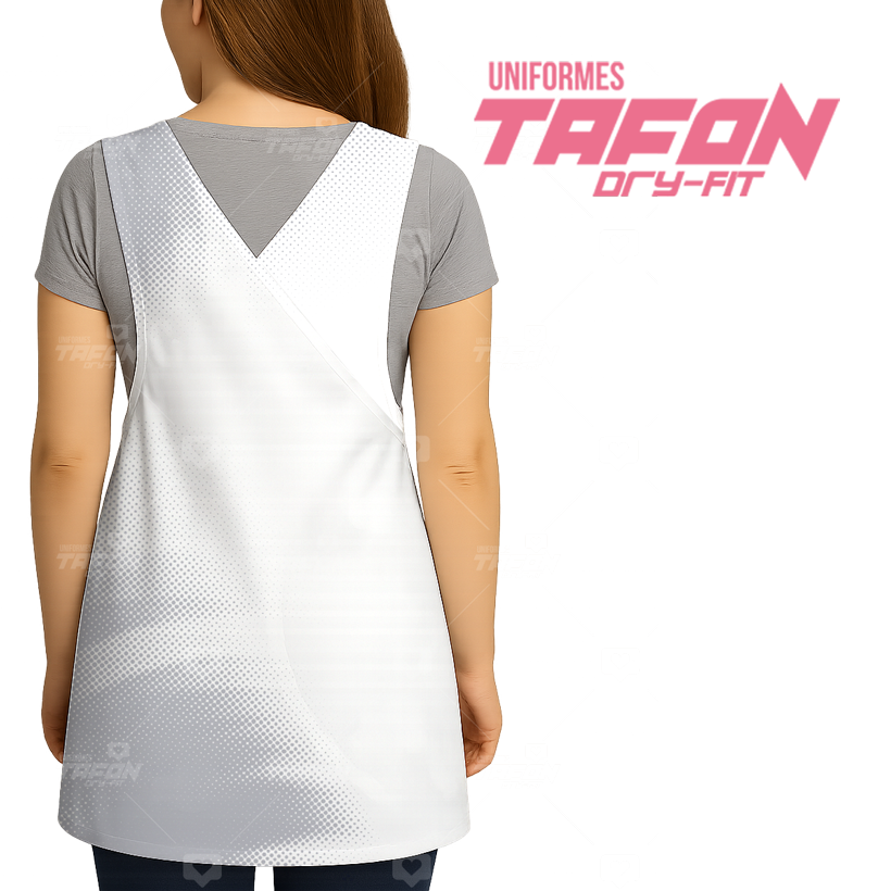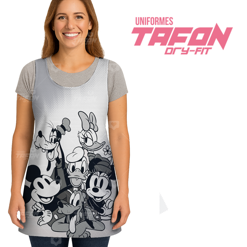 Delantal moderno y cómodo tipo japonés, confeccionado en tela Dry-Fit ligera y fresca, ideal para maestras y educadoras. Su diseño en tonos blanco, gris y negro muestra un grupo de personajes animados clásicos con expresiones divertidas, que transmiten alegría y simpatía en el aula.