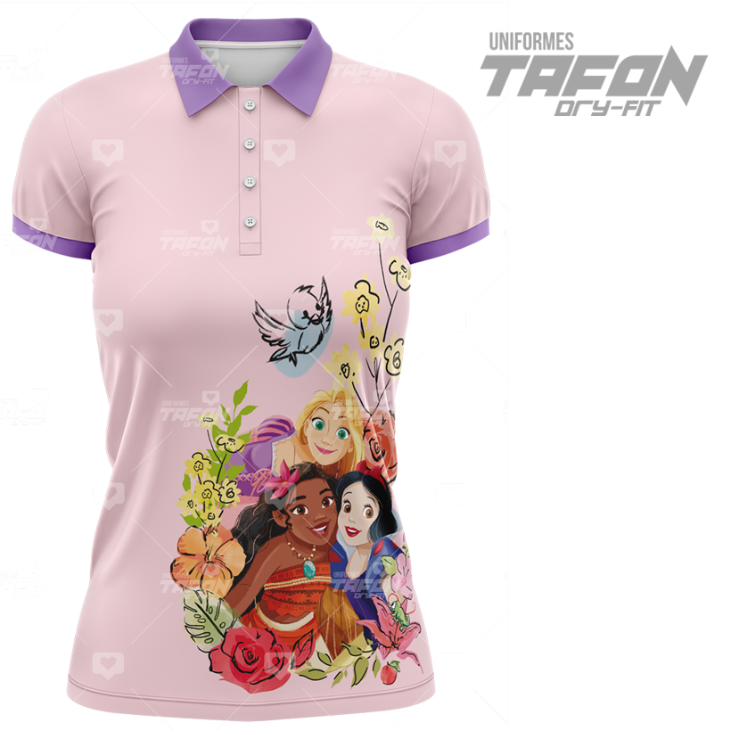 Una polo sublimada de corte femenino en tono rosa pastel con detalles morados en cuello y mangas, que resalta por su delicadeza y frescura.