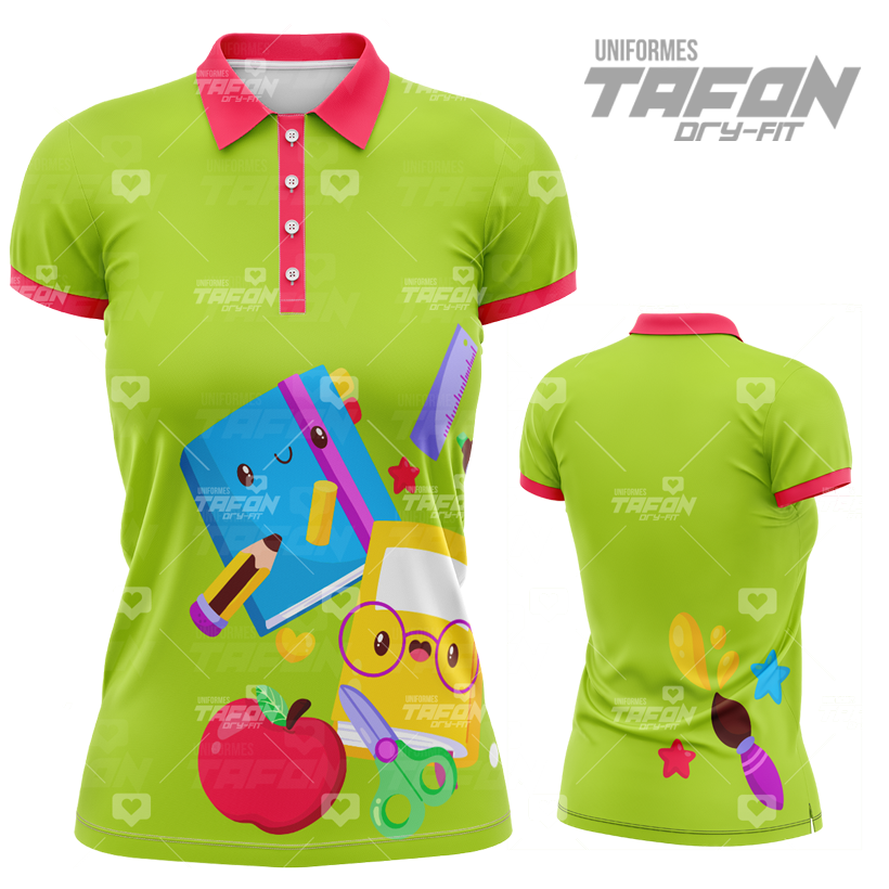 Una polo sublimada femenina en verde vibrante con cuello y mangas en rojo, diseñada especialmente para transmitir energía, entusiasmo y creatividad.