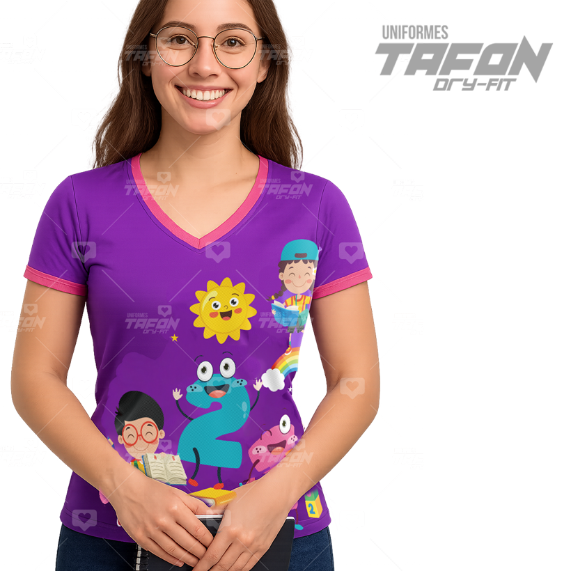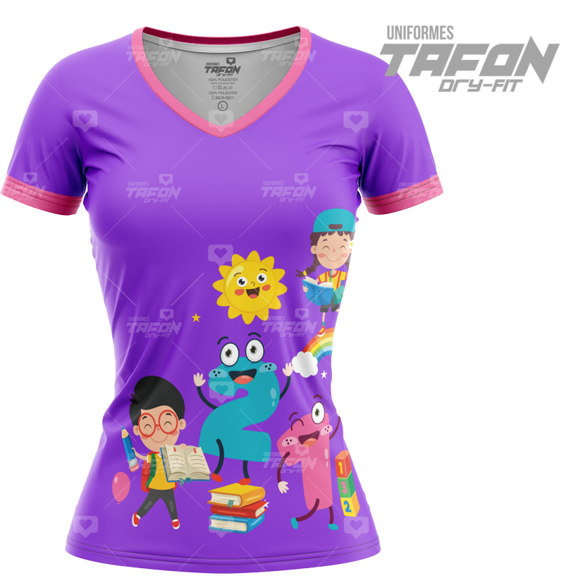 Camiseta sublimada femenina en color morado vibrante con ribetes rosados, diseñada para maestras y educadoras que quieren proyectar alegría y dinamismo en el aula.