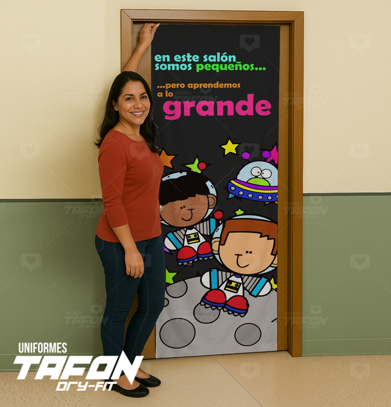 Transforma cada aula con nuestros vestidos para puertas en tela sublimada, diseñados para dar color, alegría y un mensaje positivo a los espacios escolares. Cada pieza se ajusta fácilmente y convierte la puerta en un recurso educativo y decorativo que cautiva a estudiantes y maestros por igual.